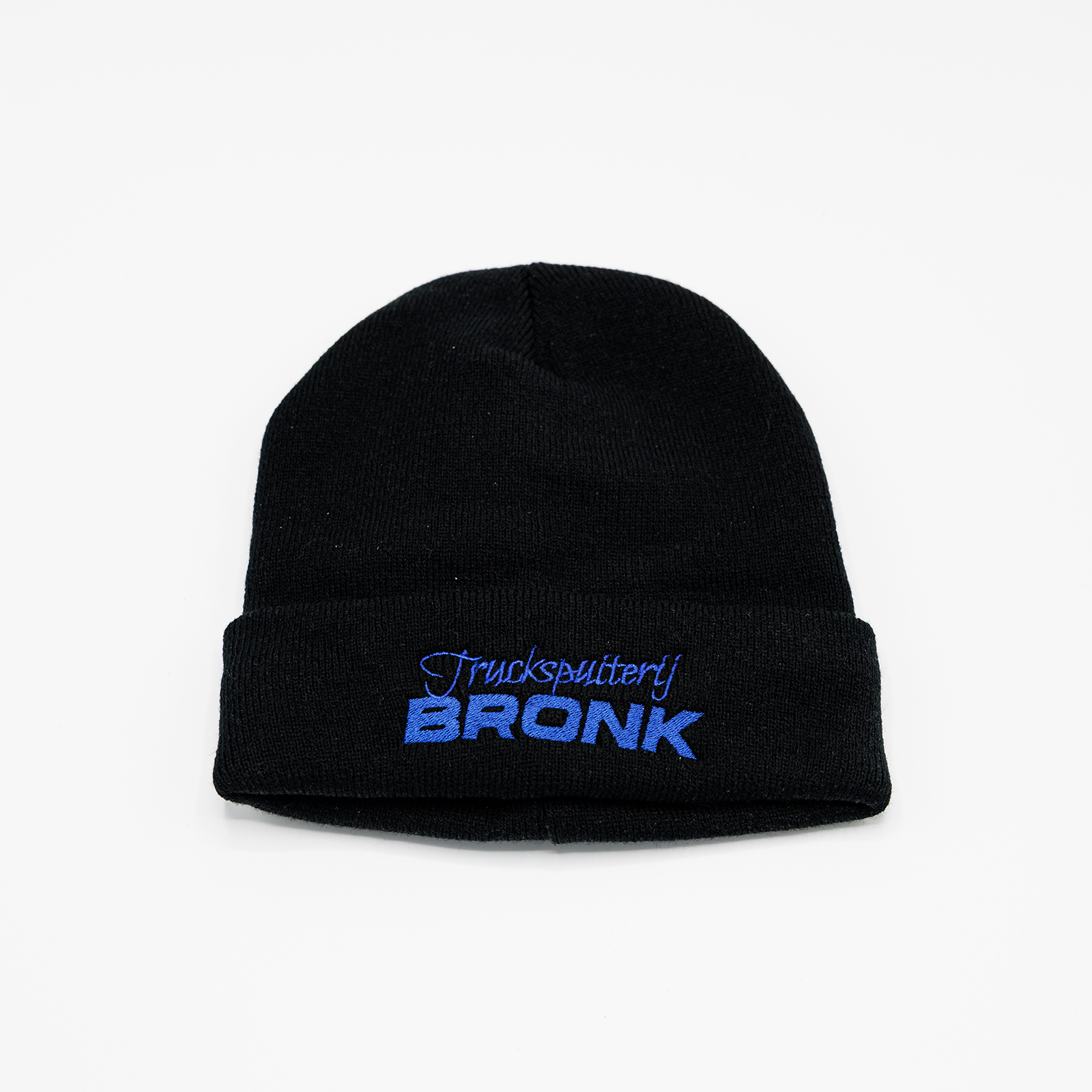 beanie muts met Truckspuiterij Bronk logo geborduurd op de muts.